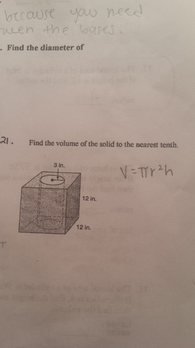 The volume of that cylinder is V(cylinder) = πr²h = π*3*3*12 = 339.29 in³