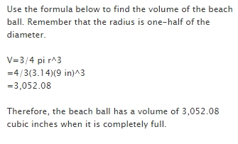 Therefore, the beach ball has a volume of 3,052.08 cubic inches when it is completely full.