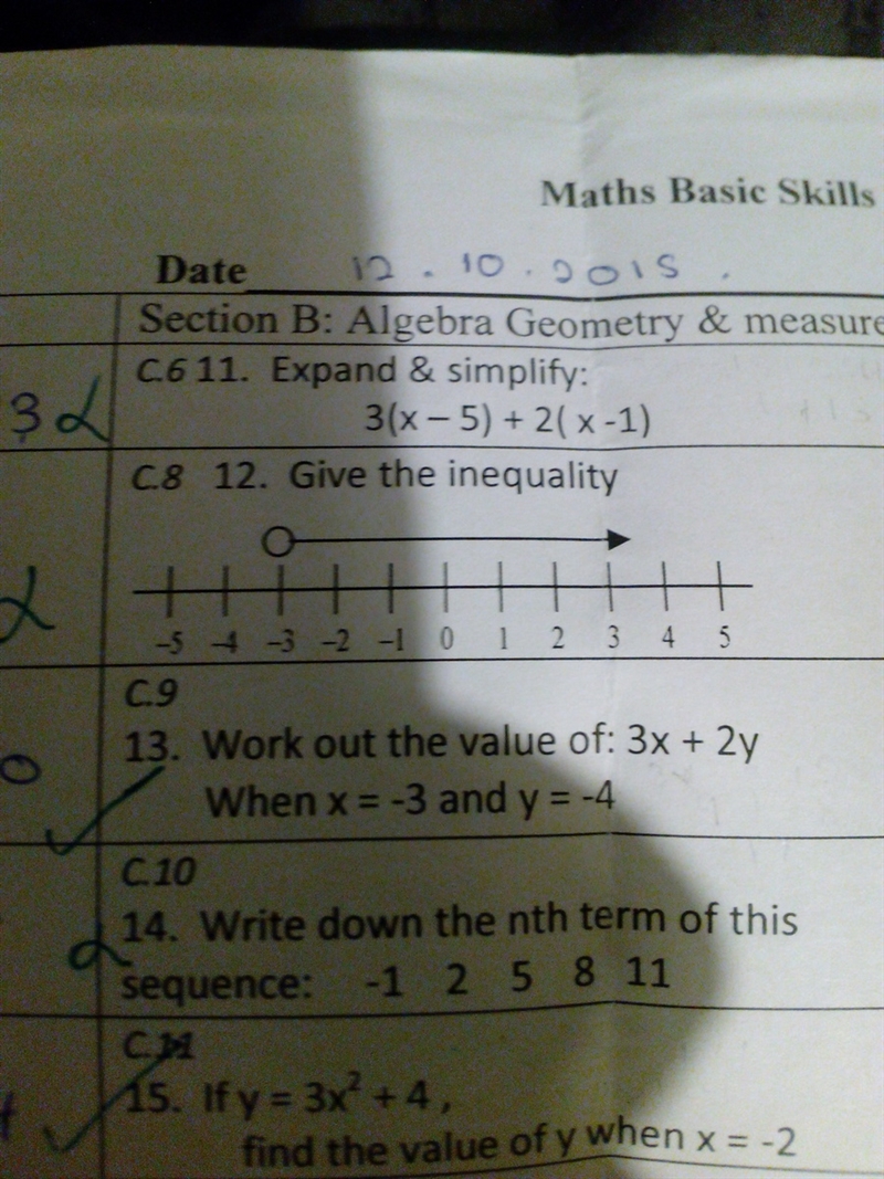 12) arrow is from -3 going towards the right side, meaning greater value. since the circle above -3 is hollow it means that it is not included or not equal.