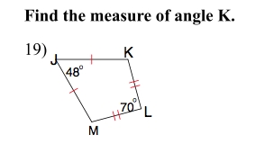 In a kite, two opposite angles are equal. In this case, angle K is equal to angle M. And since the angles in a kite add up to 360 in a quadrilateral, we can get the equation,