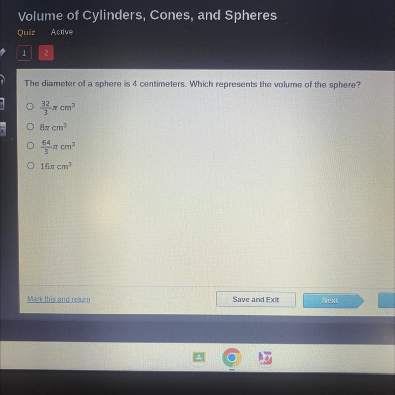 Since the diameter is 4 cm, we know the radius is 2 cm since diameter = 2 x radius. The formula for a sphere's volume is ×, so by plugging in 2 we get × = x 8 =