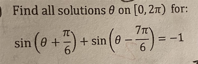 ![2sin[0.5*( \theta +( \pi)/(6) + \theta-(7 \pi)/(6) )]*cos[0.5( \theta+( \pi)/(6) - \theta+(7 \pi)/(6))]=-1](https://img.qammunity.org/2024/formulas/mathematics/college/9wk795l1taf39q6w4eo7n5c41rh4flykea.png)