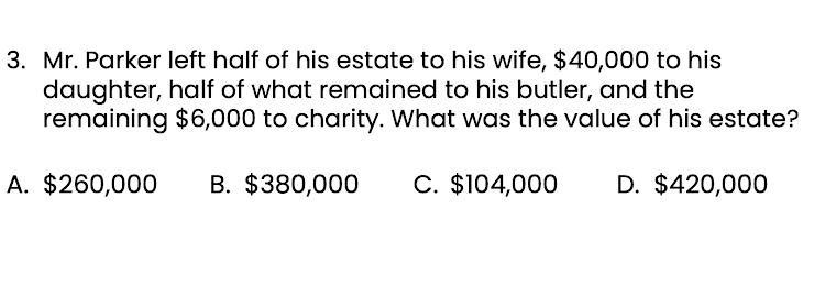This makes it much easier to see as you know the charity and Butler received the same amount. You take your total (x) and do a simple equation of x=$40,000+6,000+6,000 as you know the butler must have also received the $6,000 the charity did. You will get x=$52,000 and you know that is half of the estate as he gave the other half to his wife. This is the same as knowing the butler and charity received the same amount as halves are equal to each other. SO now all you have to do is add $52,000+$52,000=$104,000 getting your answer.