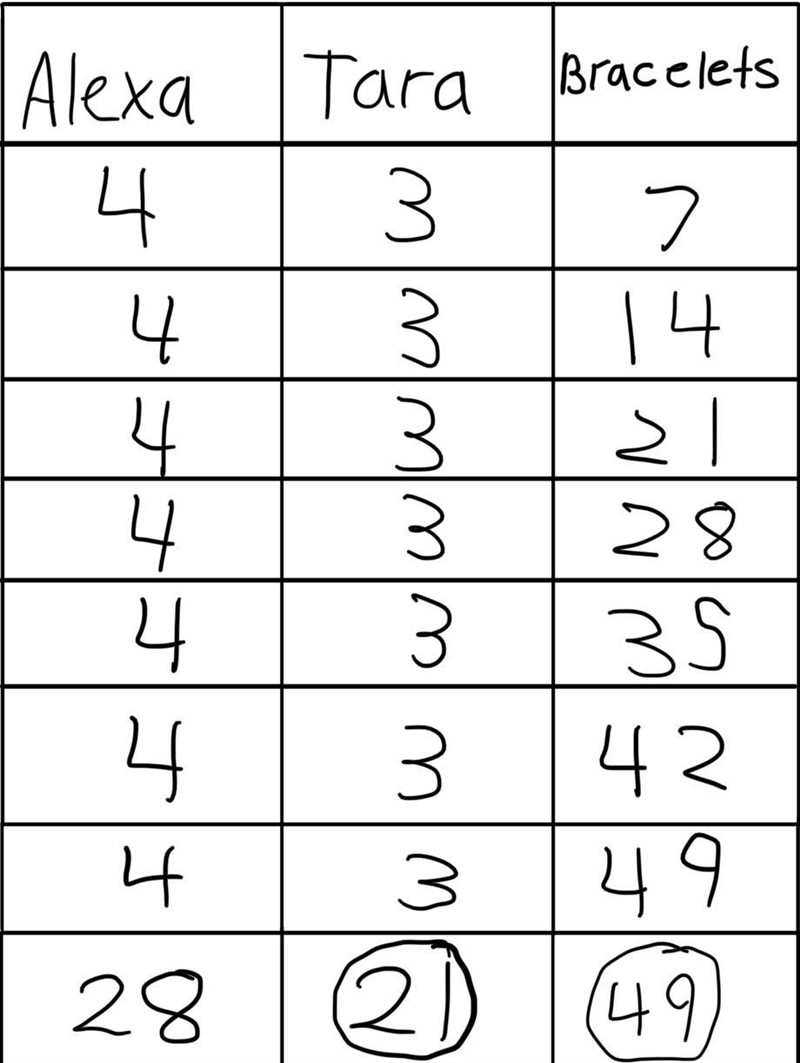Alexa and Tara were selling bracelets to raise money for charity. Alexa sold 4 bracelets for every 3 bracelets Tara sold. Together they sold 49 bracelets. How many did they each…