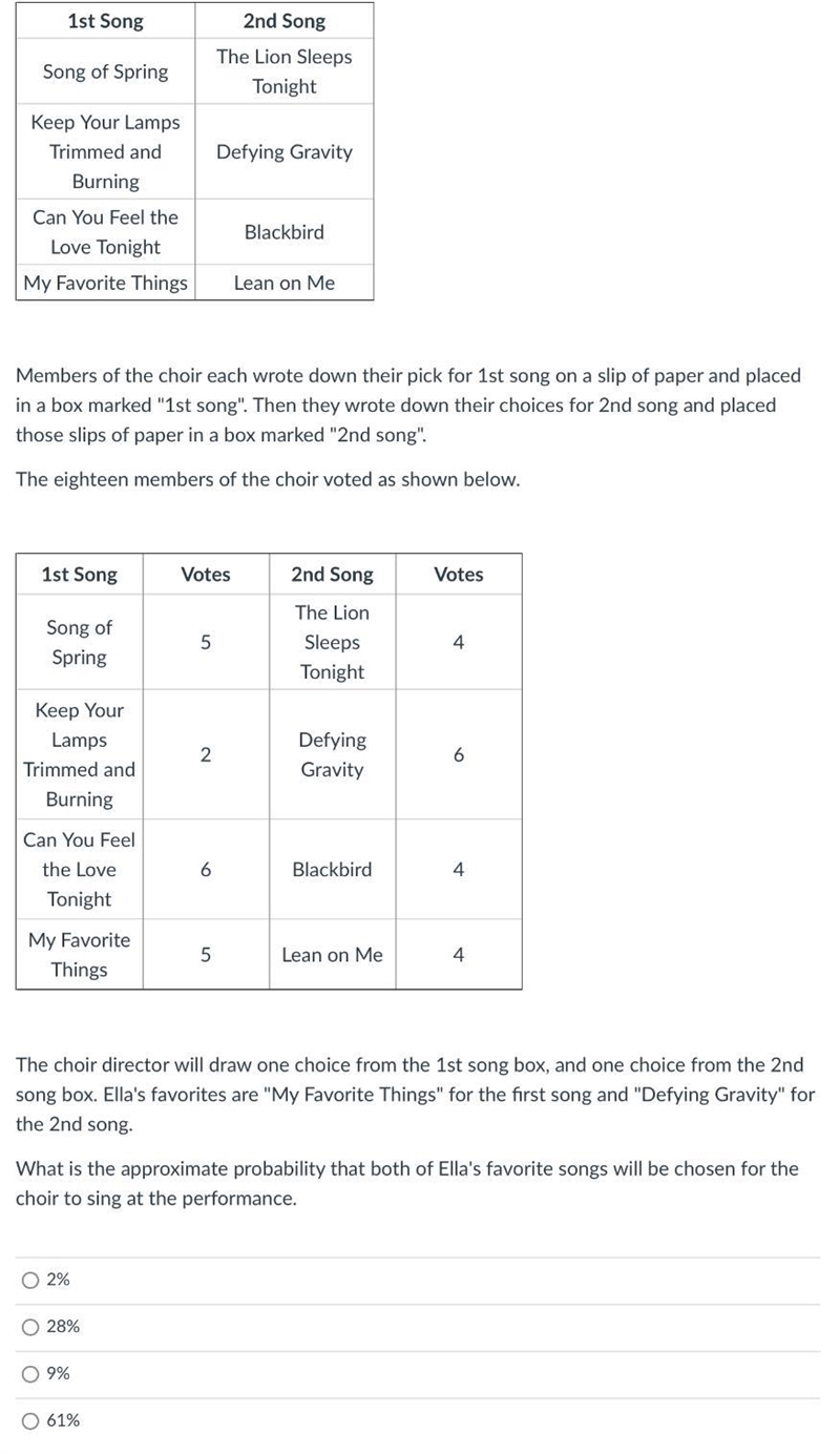 PLEASE HELP - WORTH 60 POINTS! Ella's school choir is singing two songs for their school's Artist Showcase. The choir director put these song choices on the board.