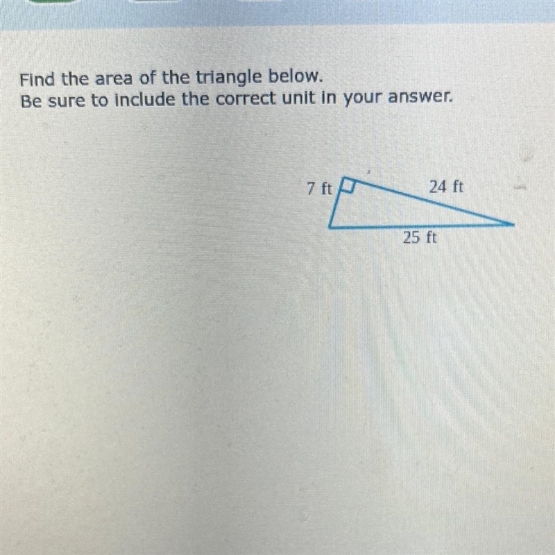 Find the area of the triangle below. Be sure to include the correct unit in your answer. 7 ft 24 ft 25 ft