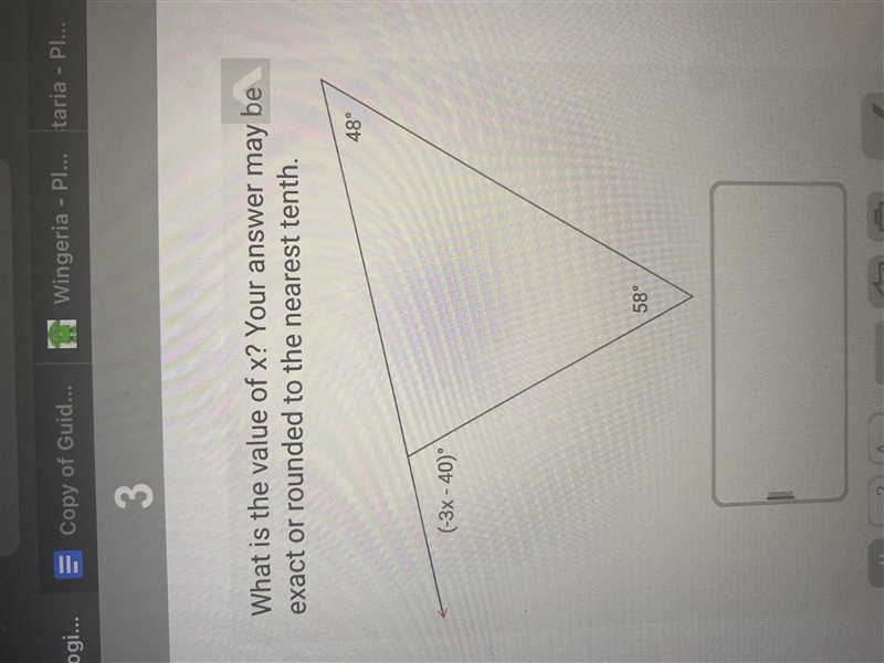 Angle 3 + (-3x - 40)° = 180° Supplementary angles