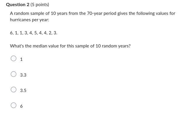 A random sample of 10 years from the 70-year period gives the following values for hurricanes per year: