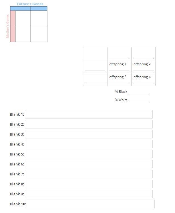 In the context of rabbit coat color, black fur is dominant to white fur. To determine the possible genotypes of the offspring from a BB male and a Bb female rabbit, we construct a Punnett square with the male's alleles (B,B) along the top and the female's alleles (B,b) down the side.