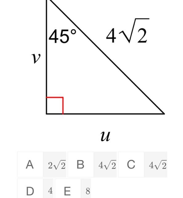 To find the length u in the given figure, we need to use trigonometry. In the figure, we have a right triangle with angle V measuring 45 degrees and the side adjacent to angle V labeled as 4√2. We want to find the length of the hypotenuse, which is labeled as u. To solve for u, we can use the trigonometric function cosine (cos). In a right triangle, cosine is defined as the ratio of the length of the adjacent side to the hypotenuse. So, cos(45°) = adjacent/hypotenuse 4√2/u To find u, we can rearrange the equation and solve for u: u = 4√2 / cos(45°) The cosine of 45 degrees is equal to 1/√2, so we can substitute this value: u = 4√2 / (1/√2) To divide by a fraction, we multiply by its reciprocal: u = 4√2 * (√2/1) Simplifying the expression: u = 4 * 2 = 8 Therefore, the length u is equal to 8 units. Note: The answer provided is based on the given information and assumptions made from the diagram. If any additional information or context is provided, it may affect the solution.