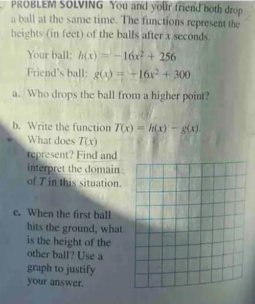 You and your friend both drop a ball at the same time. The function h(x) = -16x² + 256 represents the height (in feet) of your ball after x seconds. The function g(x) = -16x² + 300 represents the height (in feet) of your friend's ball after x seconds.