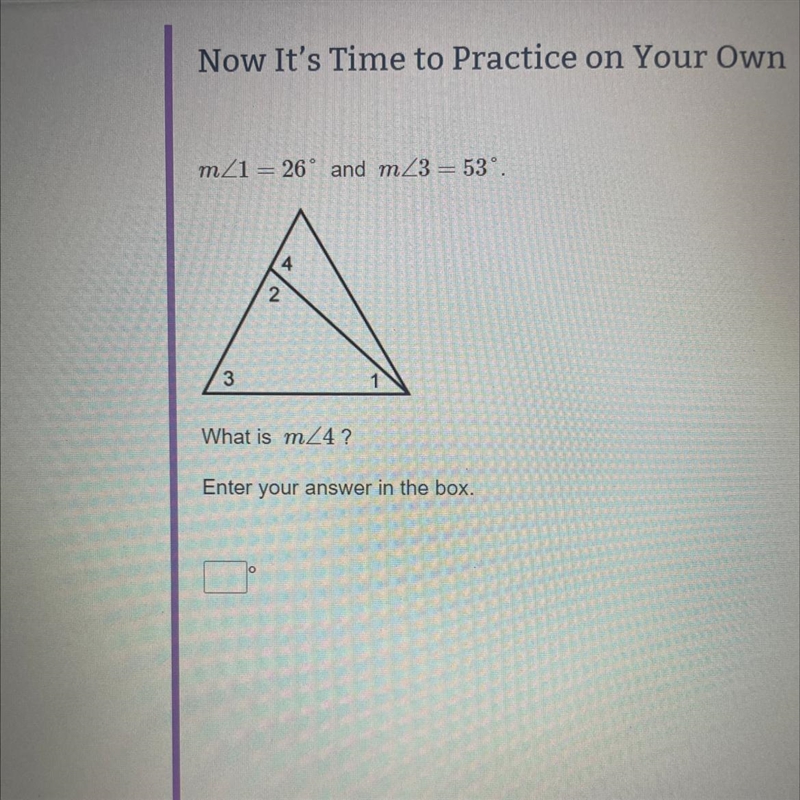 M angle 1=26° and m angle 3 = 53°. What is m angle 4? Enter your answer in the box.