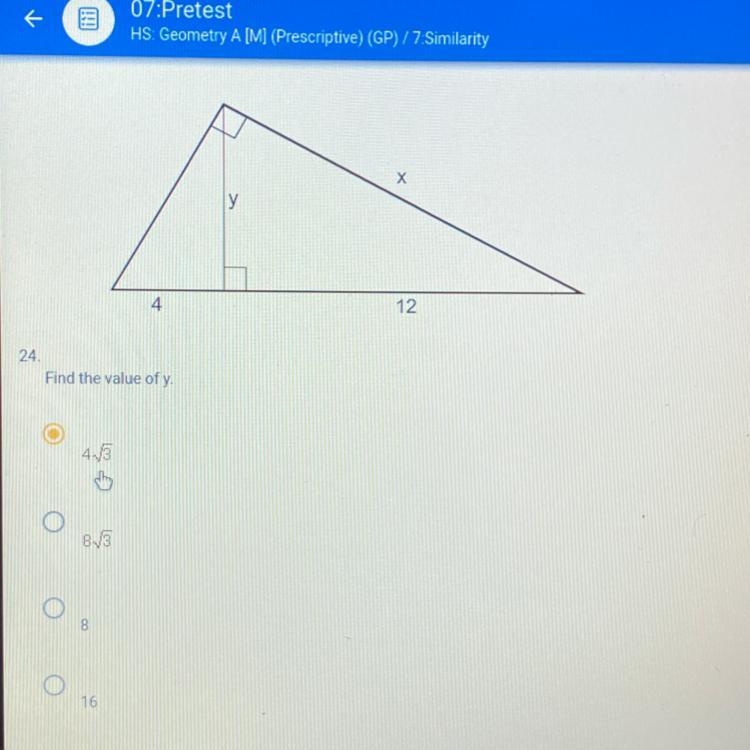 The value of y in the triangle is 4√3 ( option A)