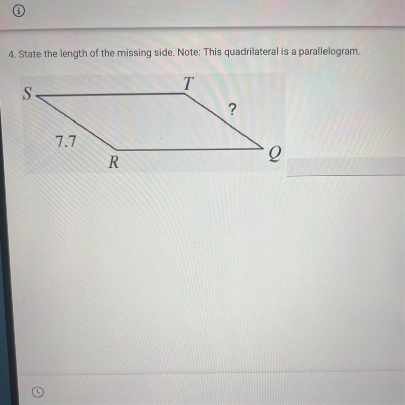 For example, in the provided context, if the side TR is 7.7 units long, and TR is opposite to side QS, then the length of QS would also be 7.7 units, since QS = TR. Similarly, if one side is labeled as 2 units and you are asked to find the missing side that it is parallel to, that missing side would also measure 2 units in length because both are sides of the same parallelogram.