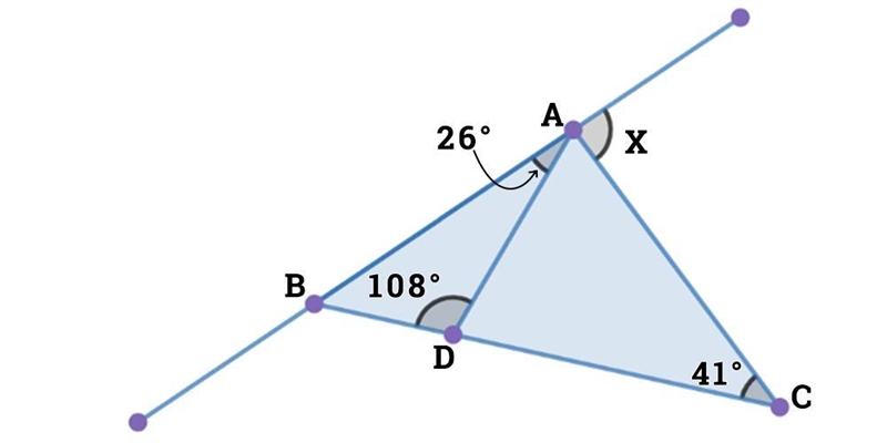 The first step in solving for x in the illustartion is (c) use the triangle sum theorem to calculate the missing angle measurement in the smaller triangle
