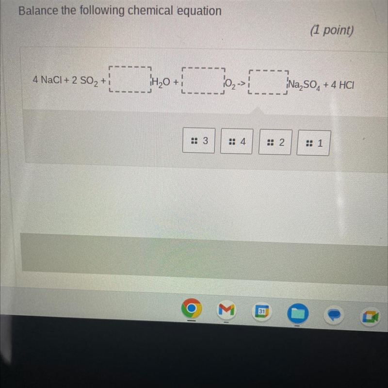 To balance the chemical equation, we need to ensure that the number of atoms of each element on the reactant side is equal to the number on the product side. There seems to be a typo in the student's provided equation, so I will assume it's meant to be a combination of the sodium chloride reaction with water to form sodium hydroxide, hydrogen gas, and chlorine gas: