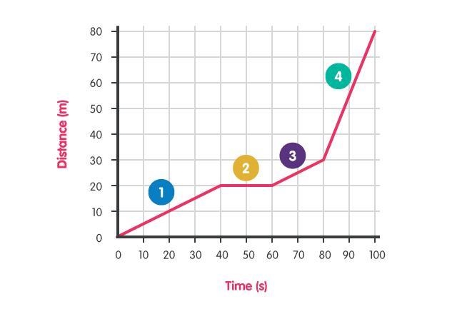 From the graph, it appears that Angela travels from about 30m to 80m in distance, a change of 50m, and from about 80s to 100s in time, a change of 20s.