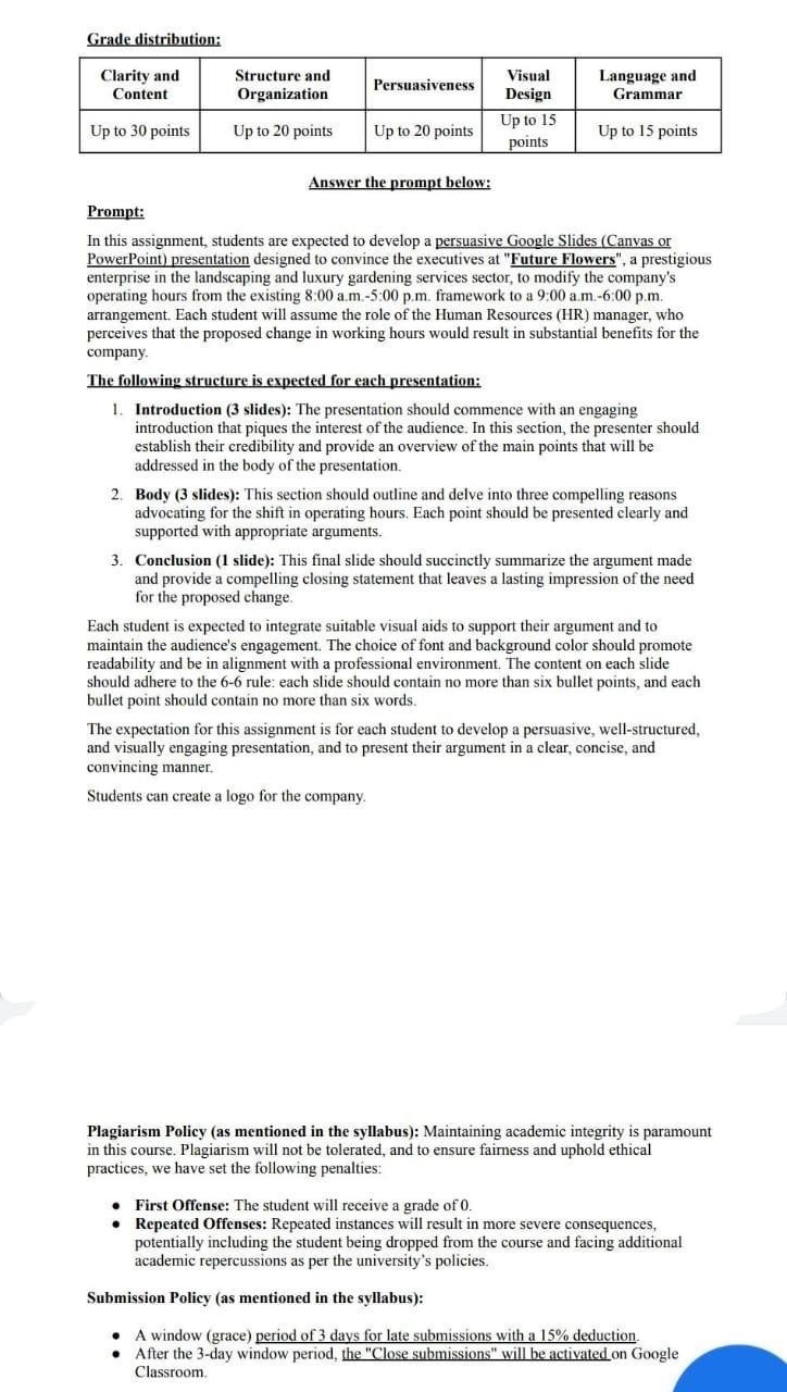 In this assignment, students are expected to develop a persuasive (Canvas or PowerPoint) presentation designed to convince the executives at "Future Flowers", a prestigious enterprise in the landscaping and luxury gardening services sector, to modify the company's operating hours from the existing 8:00 a.m.-5:00 p.m. framework to a 9:00 a.m.-6:00 p.m. arrangement. Each student will assume the role of the Human Resources (HR) manager, who perceives that the proposed change in working hours would result in substantial benefits for the company.