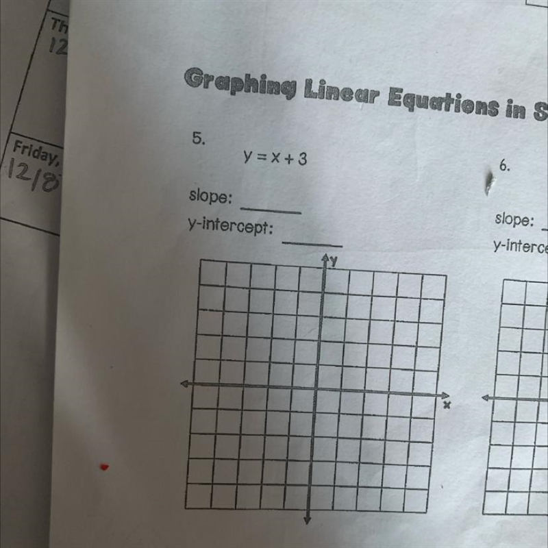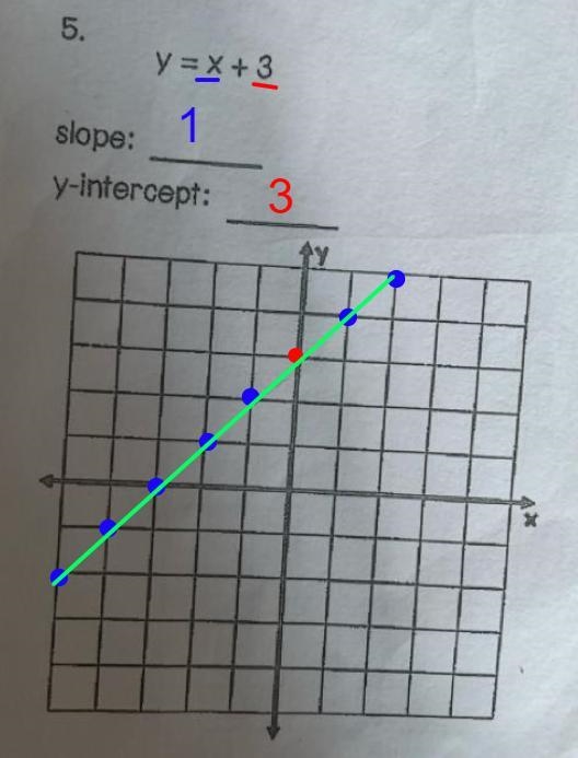 This equation is given in slope-intercept form. This is written as y = mx + b, where m is the slope and b is the y-intercept. This means that in the linear equation y = x + 3, our slope is 1 and our y-intercept is 3.