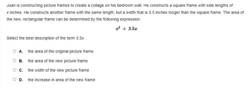 Juan is constructing picture frames to create a collage on his bedroom wall. He constructs a square frame with side lengths of x inches. He constructs another frame with the same length, but a width that is 3.5 inches longer than the square frame. The area of the new, rectangular frame can be determined by the following expression.