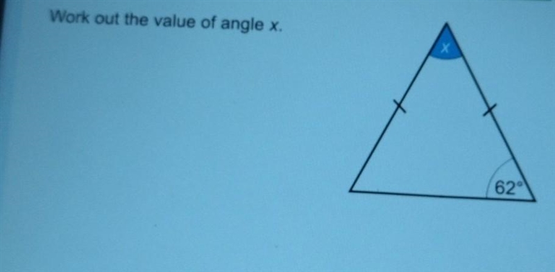so we have two angles of 62° and an unknown angle, we remove the known angles from 180° and we will have the angle x