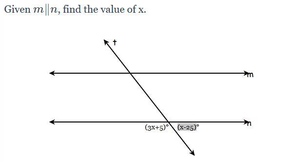 Please help !!!! Given m∥n, find the value of x. (3x+5) (x-25) = 180 degrees