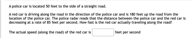 from the problem we know x (50 ft), y (180 ft), dz/dt (85 ft/s). we calculated z (the Hypotenuse = sqrt(34900), and since the cop is not moving, we know dx/dt = 0.