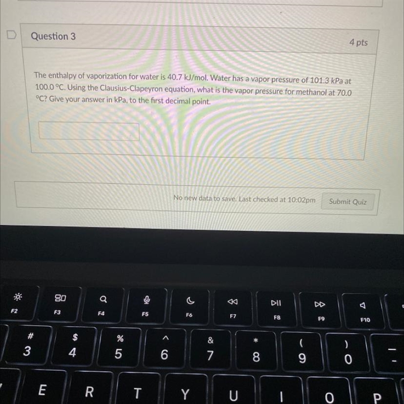 where P₁ and T₁ are the vapor pressure and temperature of the first substance (water), P₂ and T₂ are the vapor pressure and temperature of the second substance (methanol), ΔH_vap is the enthalpy of vaporization, R is the gas constant (8.314 J/mol*K).