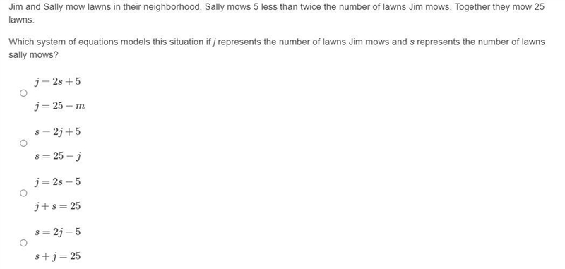You want the system of equations that models, "Sally mows 5 less than twice the number of lawns Jim mows, and together they mow 25 lawns."