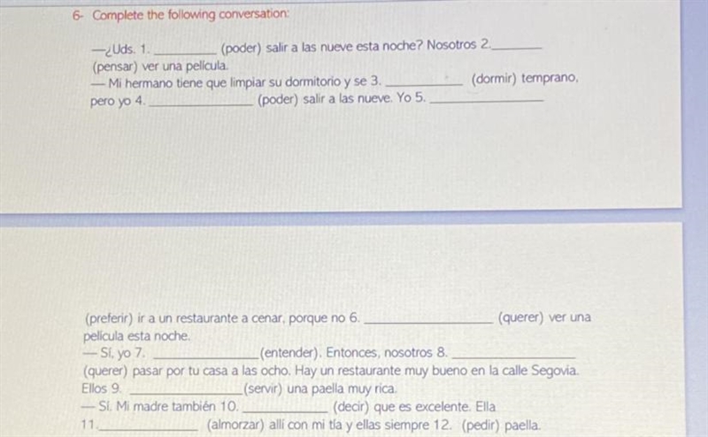 - Mi hermano tiene que limpiar su dormitorio y se duerme temprano, pero yo puedo salir a las nueve. Yo prefiero ir a un restaurante a cenar, porque no quiero ver una película esta noche.
