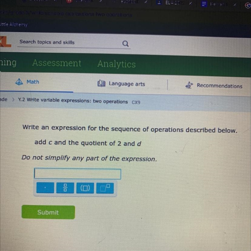 Step-by-step explanation:\Write an expression for the sequence of operations describe below Add C and the quotient of 2 and D do not simplify any part of the expression