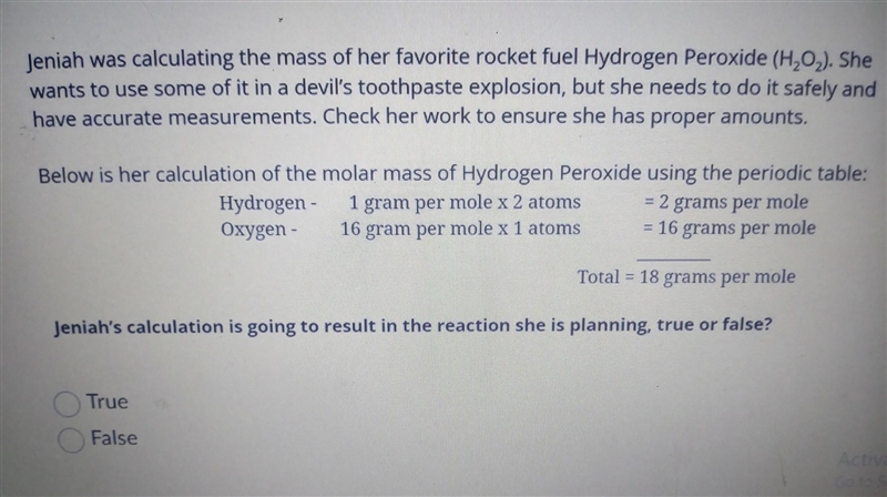 In this case, the molar mass of hydrogen peroxide that Jeniah calculated is 18 grams per mole, which is the correct molar mass for this compound. This means that if Jeniah uses this amount of hydrogen peroxide, she will have the correct amount of the compound needed for her experiment. However, it's important to note that in addition to knowing the amount of a substance needed for an experiment, it's also important to handle the substance safely and follow all necessary precautions to avoid accidents or harm.