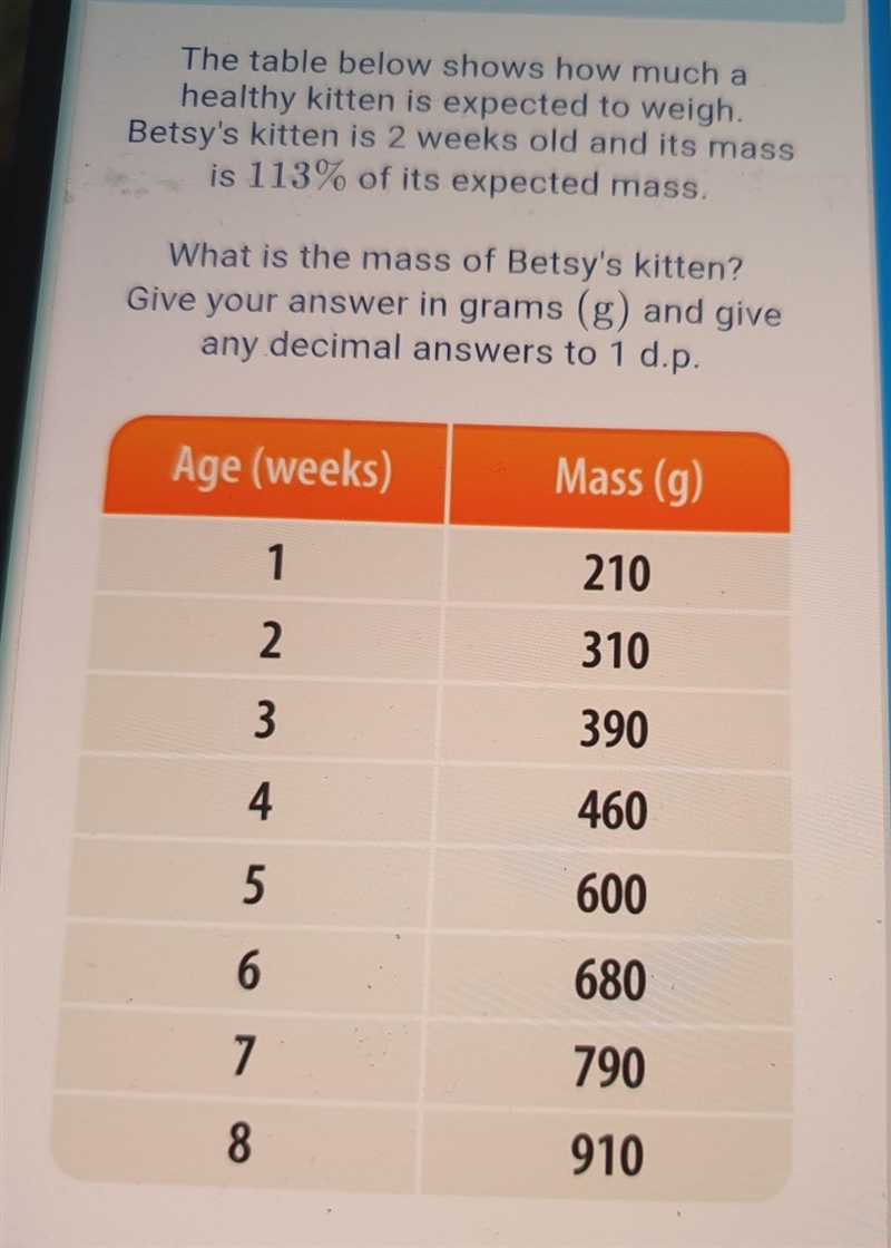 Second chance! Review your workings and see if you can correct your mistake. The table below shows how much a healthy kitten is expected to weigh. Betsy's kitten is 2 weeks old and its mass is 113% of its expected mass. What is the mass of Betsy's kitten? Give your answer in grams (g) and give any decimal answers to 1 d.p. Age (weeks) 1 2 3 4 5 6 7 8 Mass (g) 210 310 390 460 600 680 790 910 Watch video Answer >