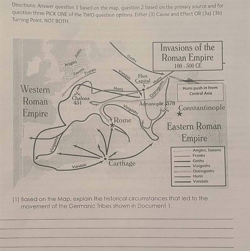 The movement of the Germanic tribes shown in Document 1 was primarily caused by the push of the Huns from Central Asia. The Huns' movement towards Europe caused a domino effect of migrations as various Germanic tribes, such as the Visigoths, Vandals, Angles, Saxons, and Franks, were displaced and forced to migrate in search of new territories to settle. The western Roman Empire's weakened state and inability to defend its borders also contributed to the ease with which these tribes were able to migrate into the region. The map highlights the various routes and directions of these migrations, which ultimately led to the establishment of new kingdoms and states in Europe.