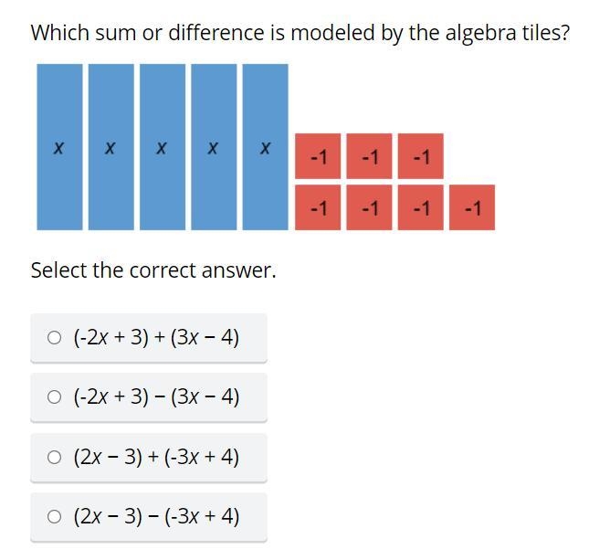 25 POINTS, PLS EXPLAIN! Which sum or difference is modeled by the algebra tiles? Select the correct answer. (-2x + 3) + (3x − 4) (-2x + 3) − (3x − 4) (2x − 3) + (-3x + 4) (2x − 3) − (-3x + 4)