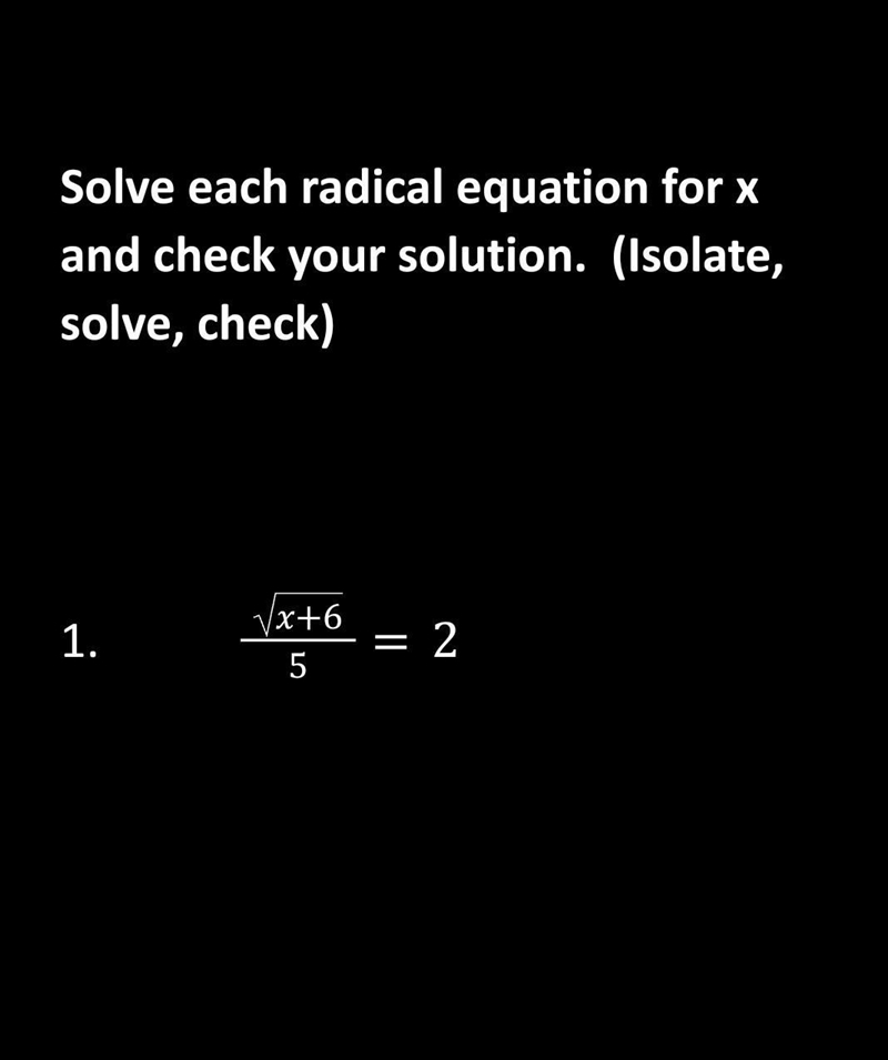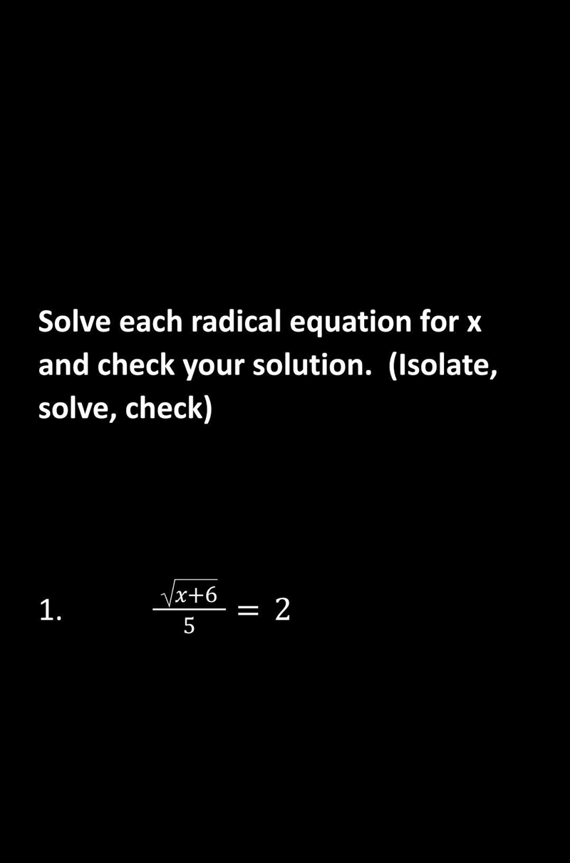 1. sqrt(x + 6)/5 = 2