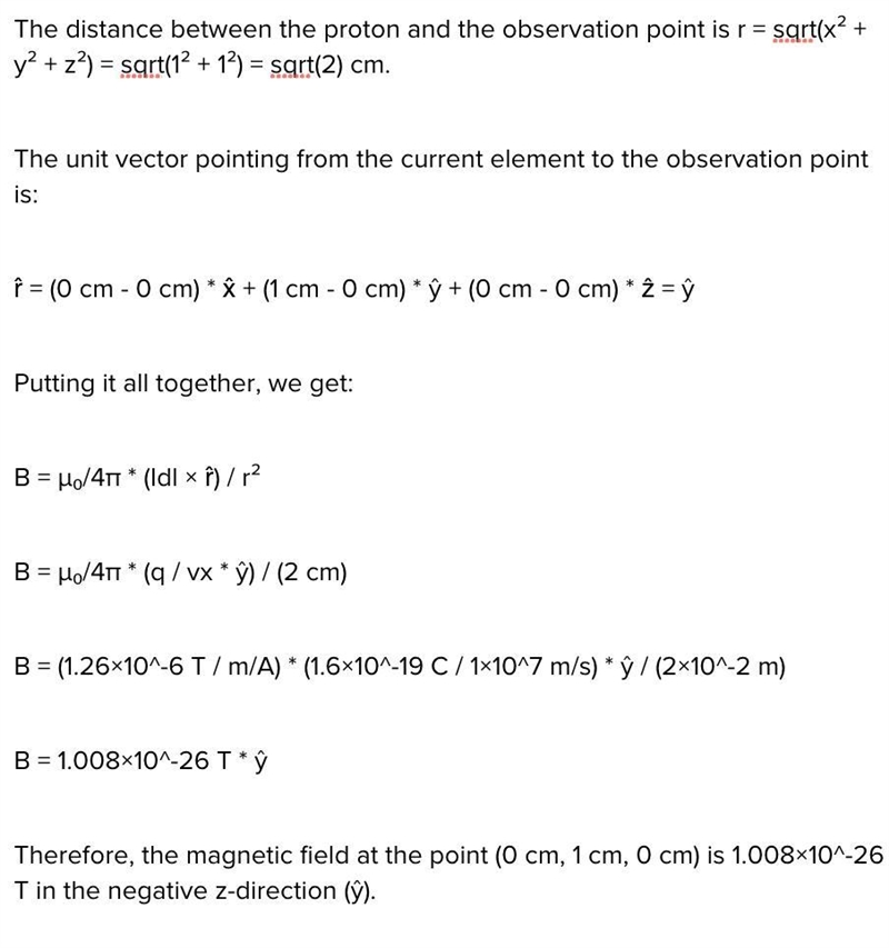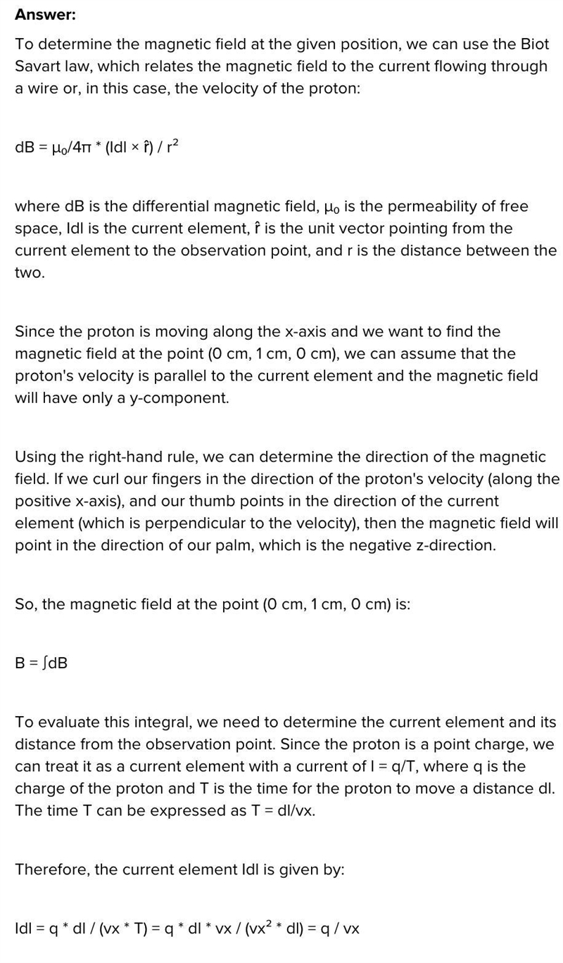 A proton moves along the x-axis with v_x=1.0×10^7m/s. As it passes the origin, what are the strength and direction of the magnetic field at the (0 cm, 1 cm, 0 cm) position? Give…
