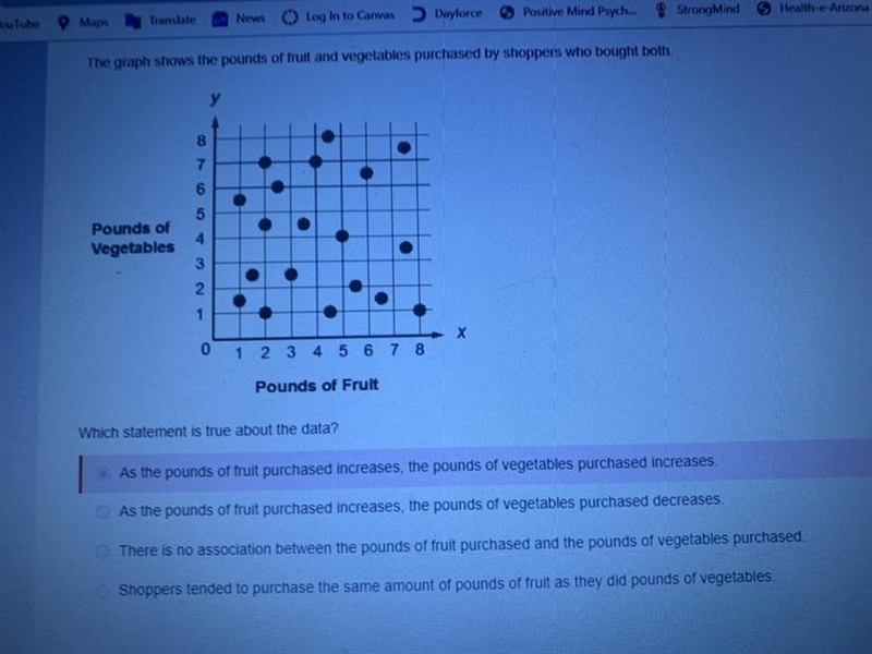 Answer: There is no association between the pounds of fruit purchased and the pounds of vegetables purchased.