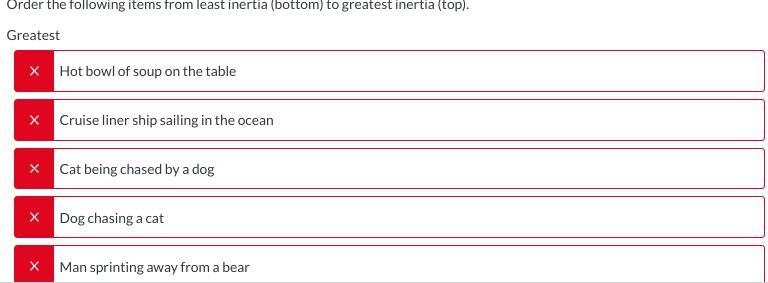 Order the following items from least inertia (bottom) to greatest inertia (top). Please Help.