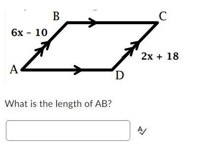 You want the length of side AB marked 6x-10 in parallelogram ABCD with side CD marked 2x+18.