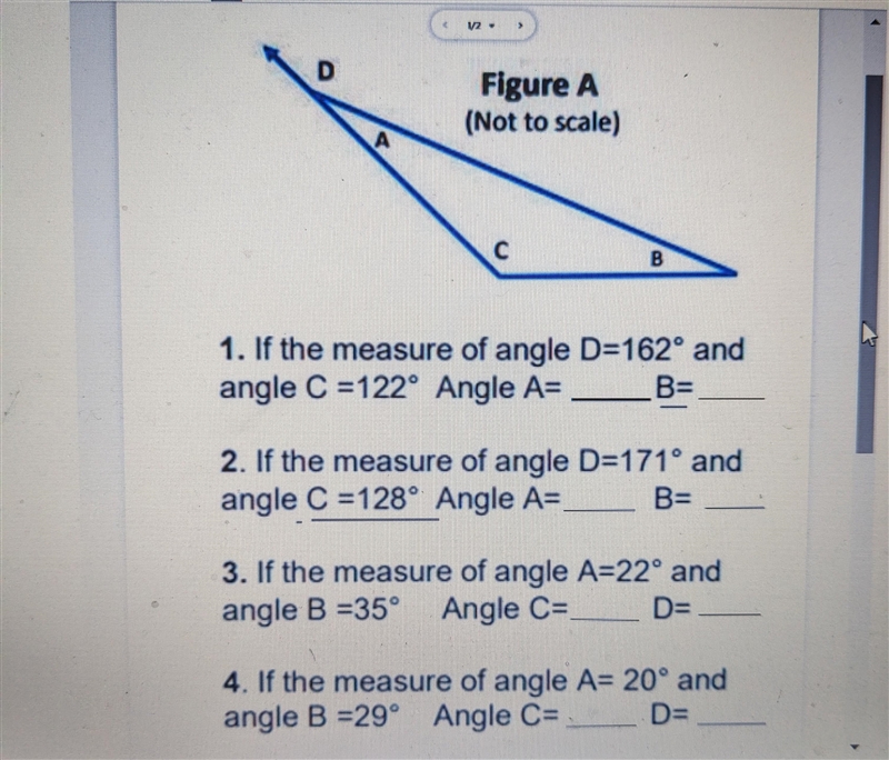 2.If the measure of angle D = 171° and angle C = 128°, then we can find the measures of angles A and B using the same method as above.