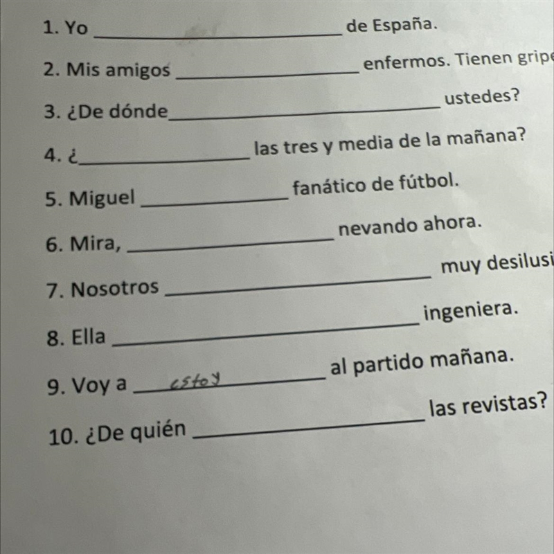 Answer:1-Estoy 2-estan 3-vienen 4-Esta a 5-es6-esta7-estamos 8-es 9-estar en 10-son
