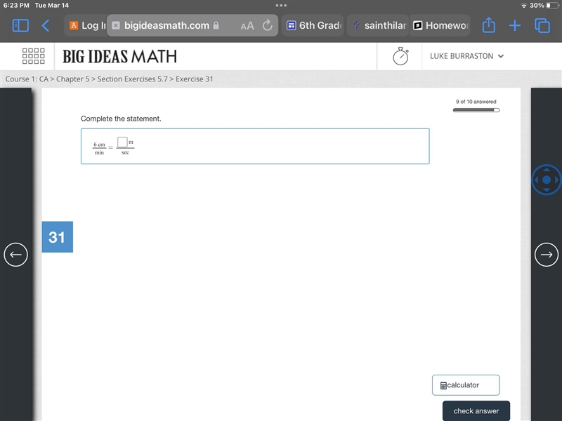 Basically just convert to seconds which is done by multiplying by 60. 6cm/60 = 0.1cm So now it’s 0.1cm per second, but it’s asking for meters. 0.1/100 is 0.001 meters.