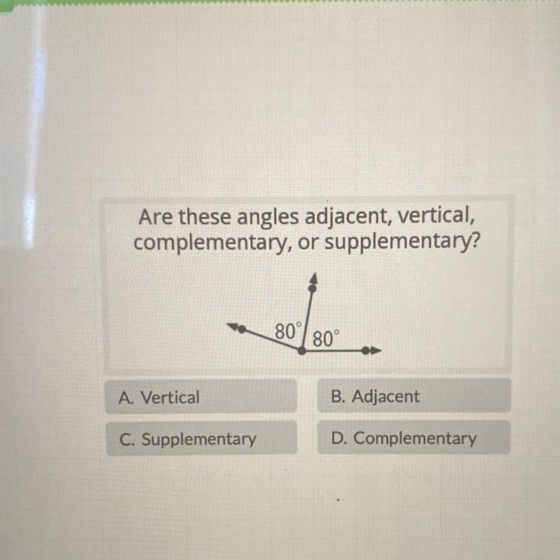 "vertical angles" are made by crossing two lines (that makes four angles) the vertical angles are opposite from each other (touching only at one point) and they are equal.
