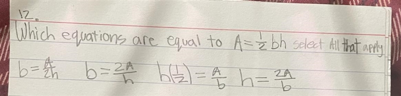To find the equations that are equal to A = 1/2bh, we need to manipulate the original equation to solve for each of the other variables (b, h).