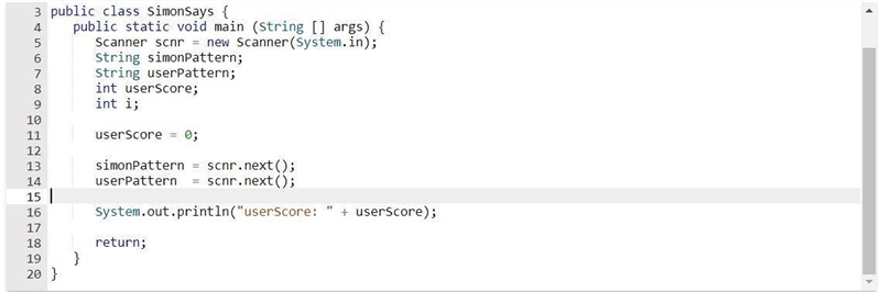 if (simonPattern.charAt(i) == userPattern.charAt(i)) {