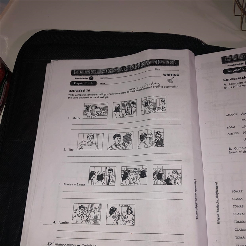 Answer: 1. Ayer Marta fue a la tienda a comprar unas cosas también fue al coreo a enviar una carta después ella fue a la biblioteca a entregar unos libros.