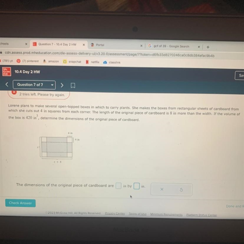 Therefore, the dimensions of the original piece of cardboard are 15 inches by 23 inches.