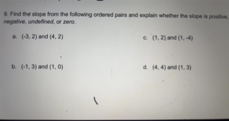 3-4/1-4 = -1/-3 = 1/3 -> this is your slope for d) and it is positive because the negatives " - " cancels out.