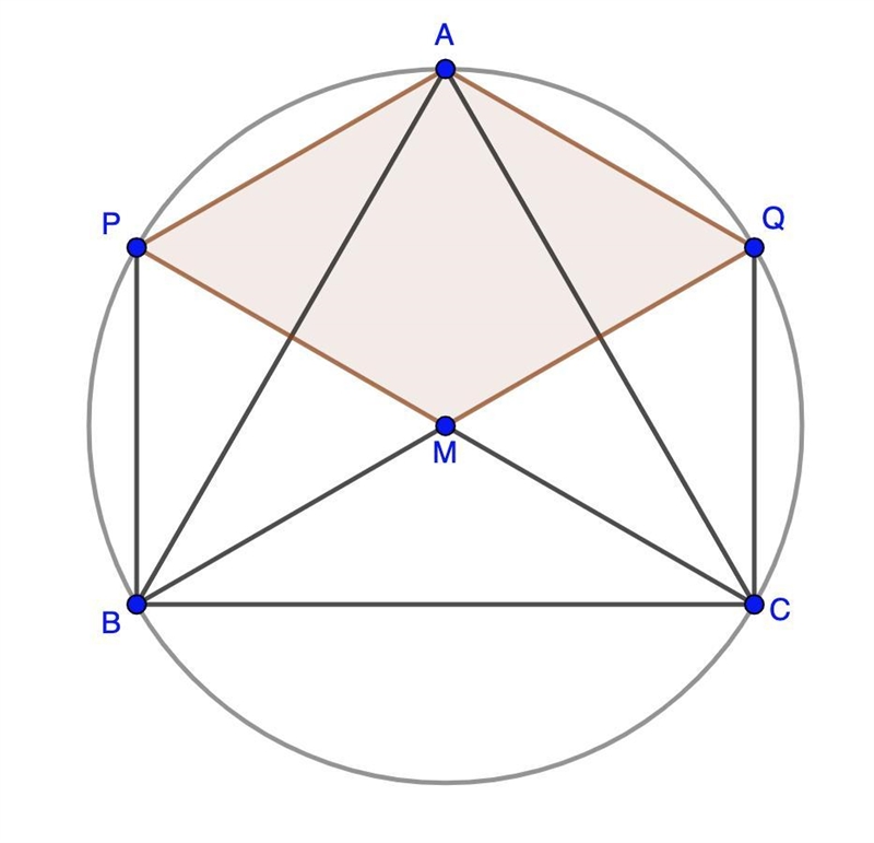 Angle CMQ is an interior angle of equilateral triangle MCQ, so is 60°. That makes angle QMP its supplement, or 120°. Vertical angle BMC is also 120°, the measure of arc BC. This means M is the center of the circumcircle.